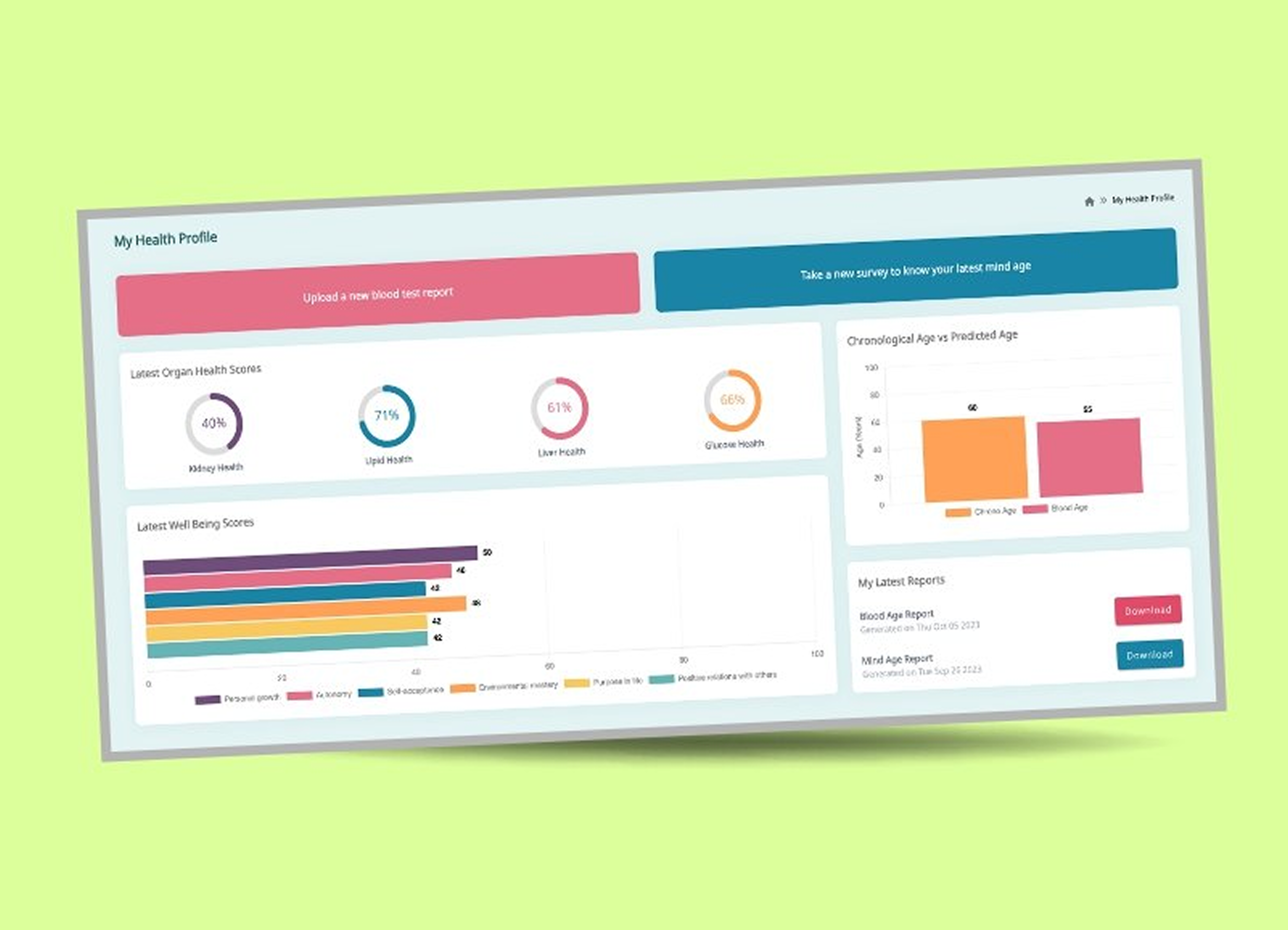 Personalized dashboards for tracking physical and mental health with full privacy, biological age and organ health insights, well-being scores from psychological questionnaires, tailored recommendations, and upcoming journaling features to support sustained wellness.